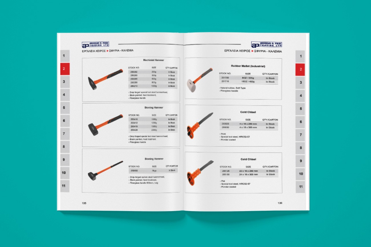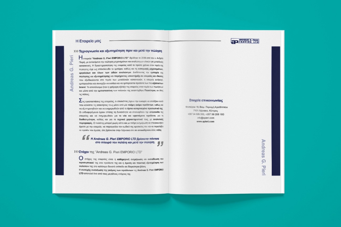 We started working with Andreas G. Pieri Emporio in 2021. Our work was to design and develop a product catalogue where all products of the company would be nicely presented under their distinct category. The product catalogue includes more than 2500 different codes and more than 950 different products.